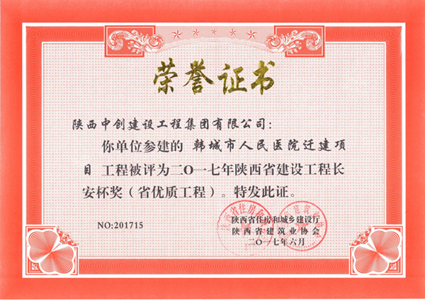 韓城市人民醫院遷建項目獲2017年長安杯獎